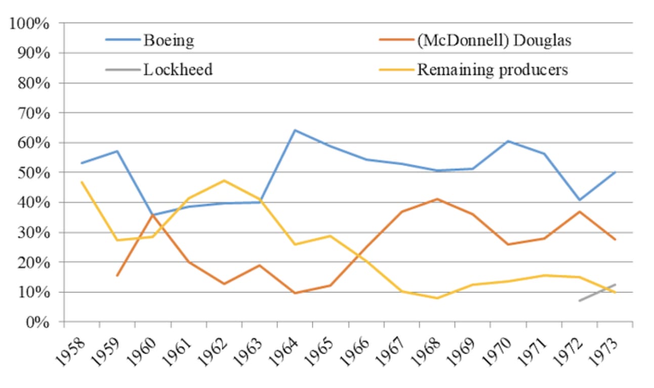 It’s also easier to build a global leadership position when your main rival wages a prolonged campaign of self-sabotage. By the new millennium, the competition had been reduced to a simple showdown between Airbus and Boeing. Lockheed had decided to bail on commercial aviation in the 1970s after losing billions of dollars on the L-1011, while Boeing acquired McDonnell Douglas in a $13 billion deal in 1997.
