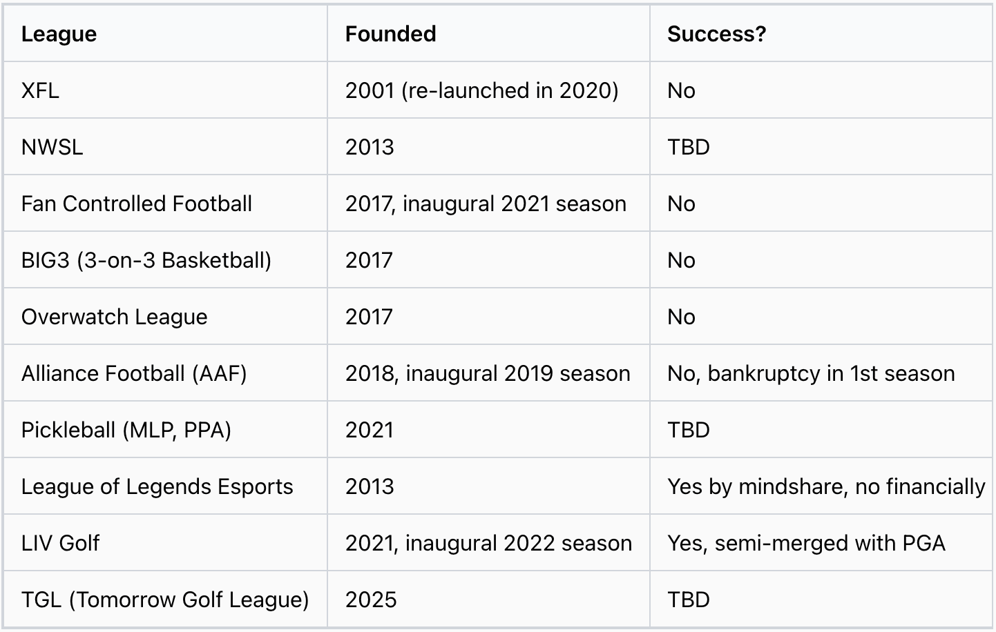 There have been over 65 well-funded attempts to create new sports leagues since the year 2000, with many billionaires and high-profile individuals including Thiel, Chernin, and Cuban backing various leagues that have all failed.