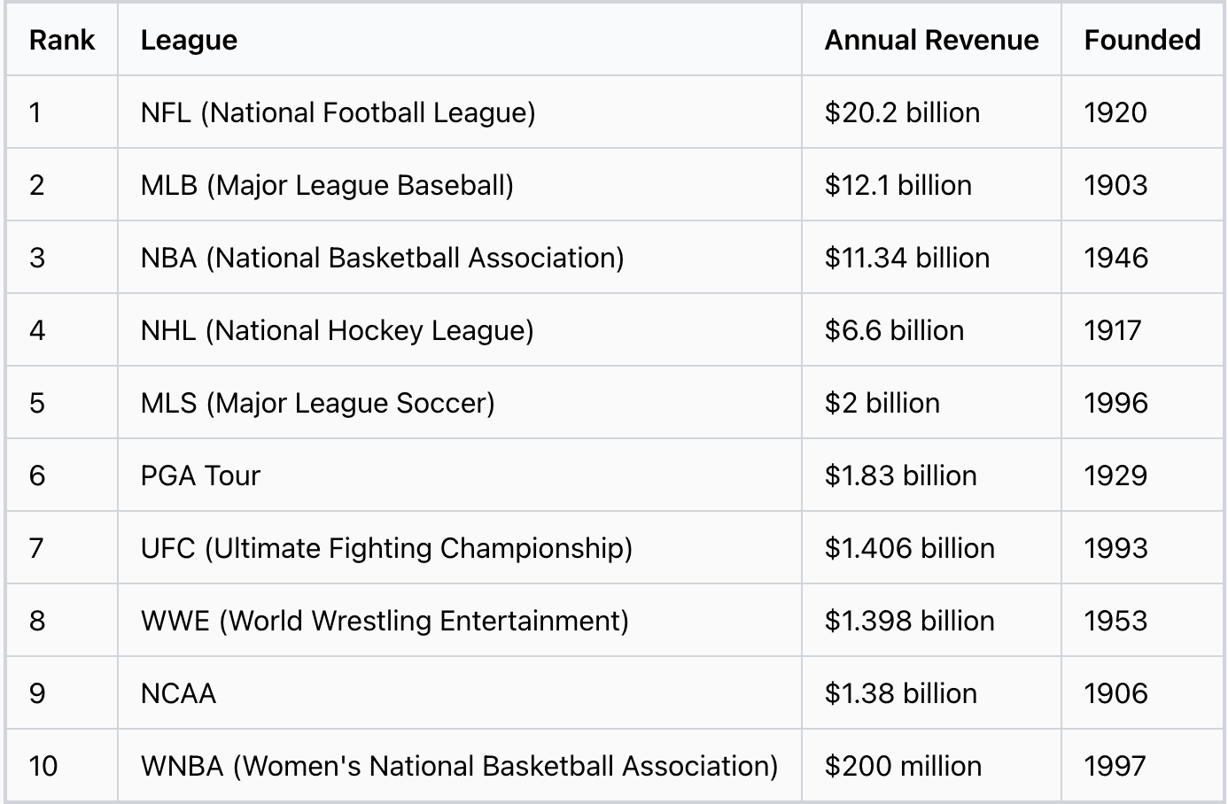 Every major US sports league today was founded in the 20th century. None of the ten largest leagues by revenue were created after 2000: